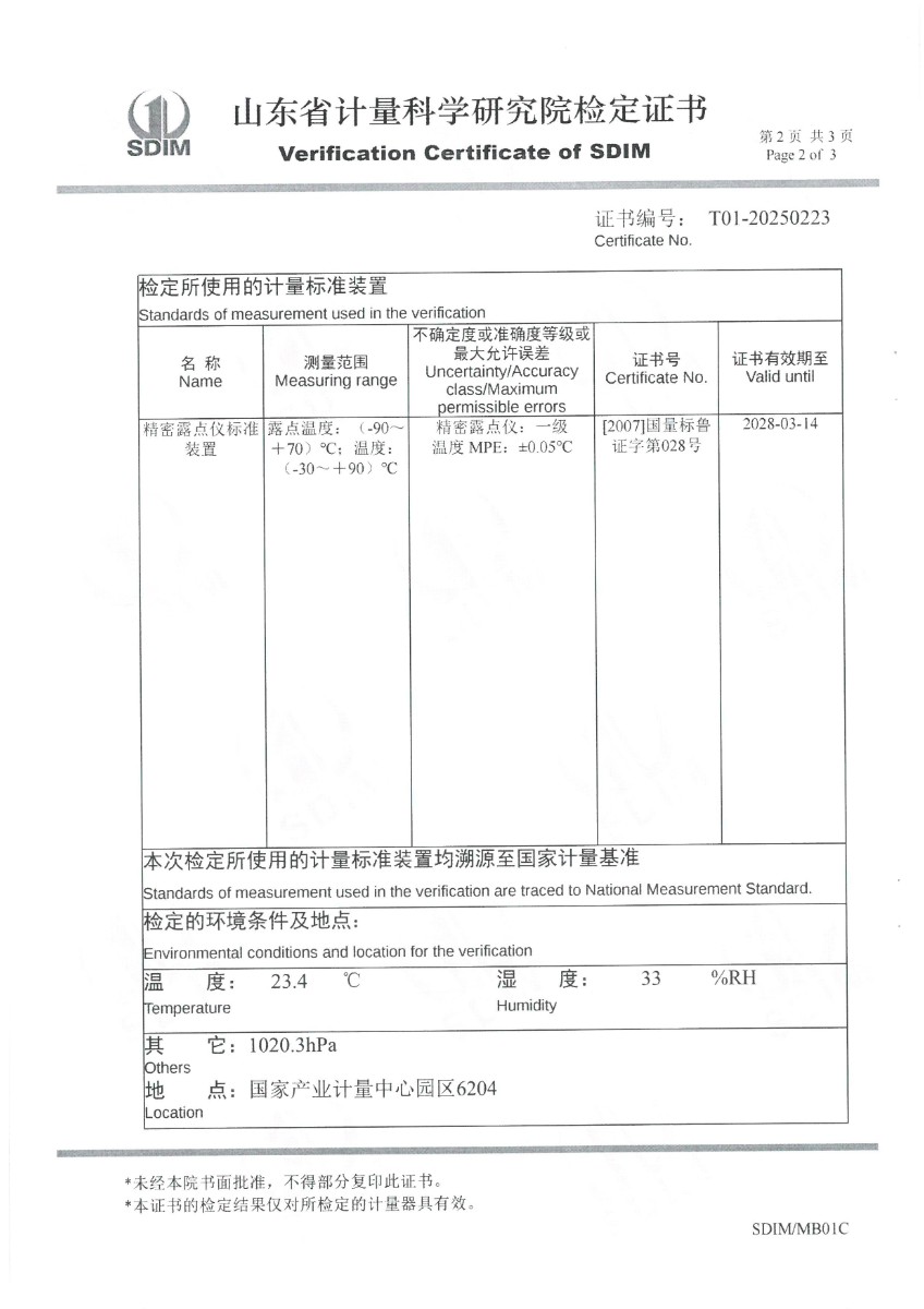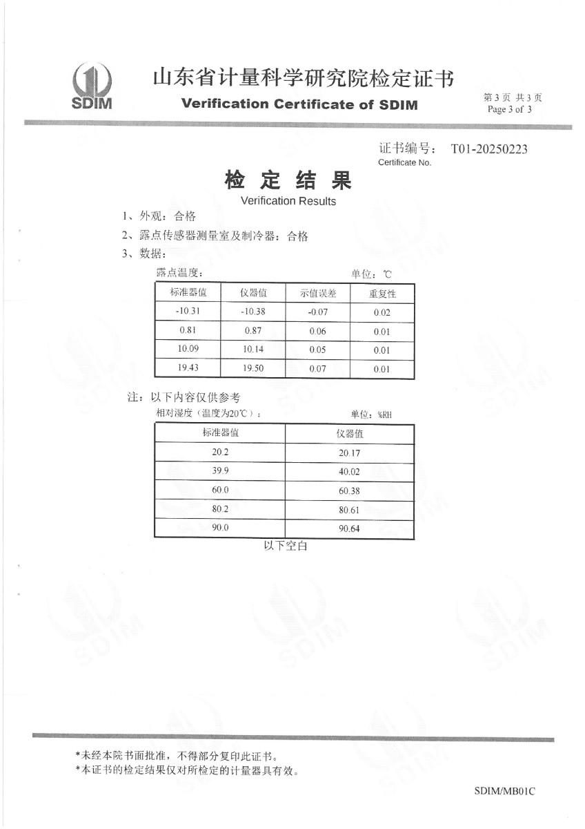 露點儀檢定、校準(zhǔn)證書