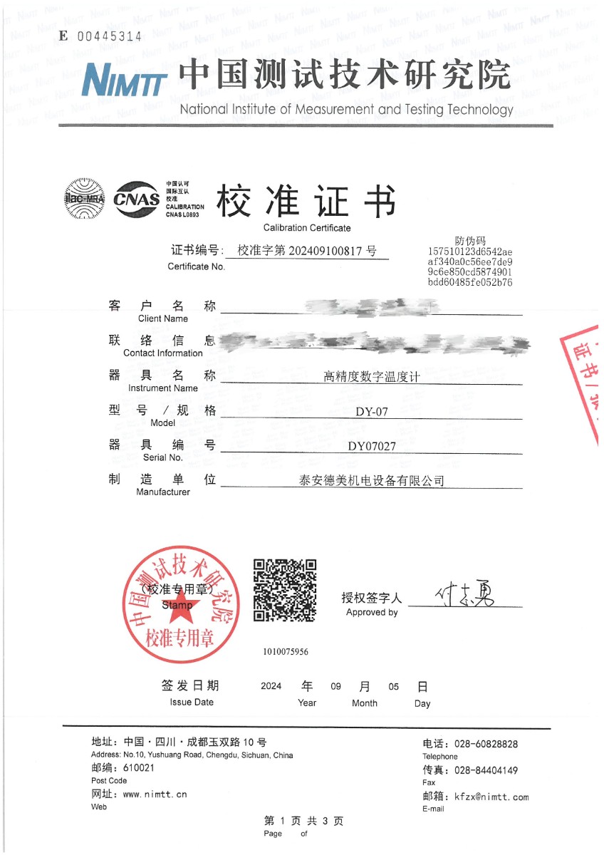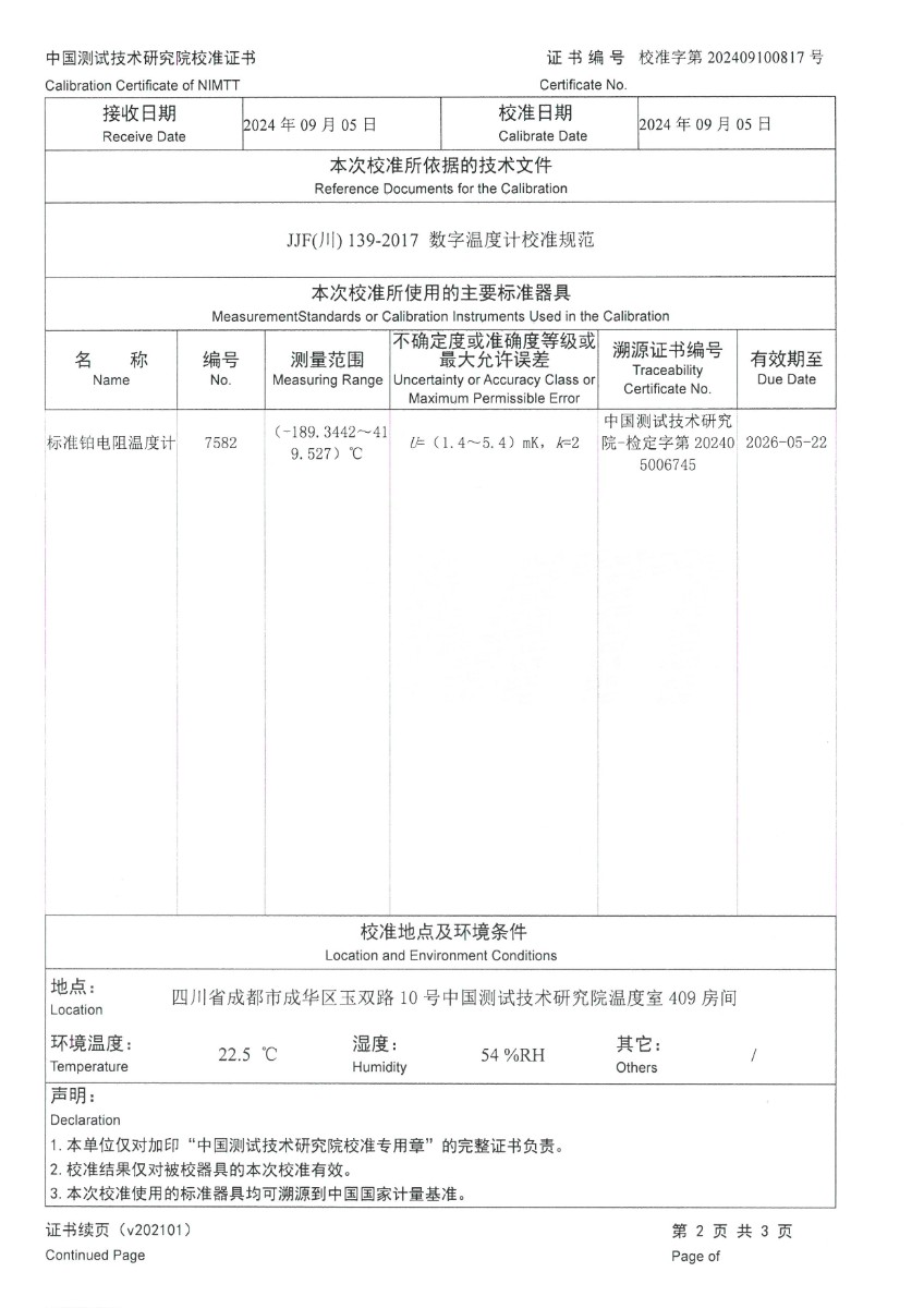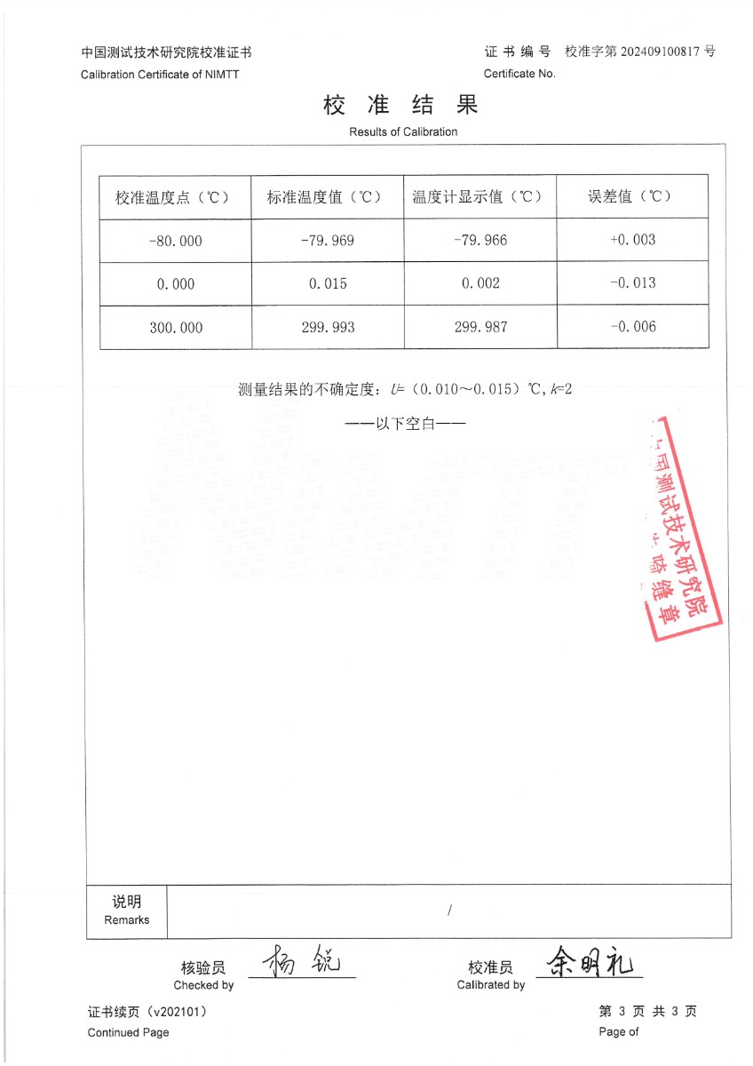 高精度數字溫度計(-80~300℃)校準證書 2024-9-7 本文被閱讀 6020 次
