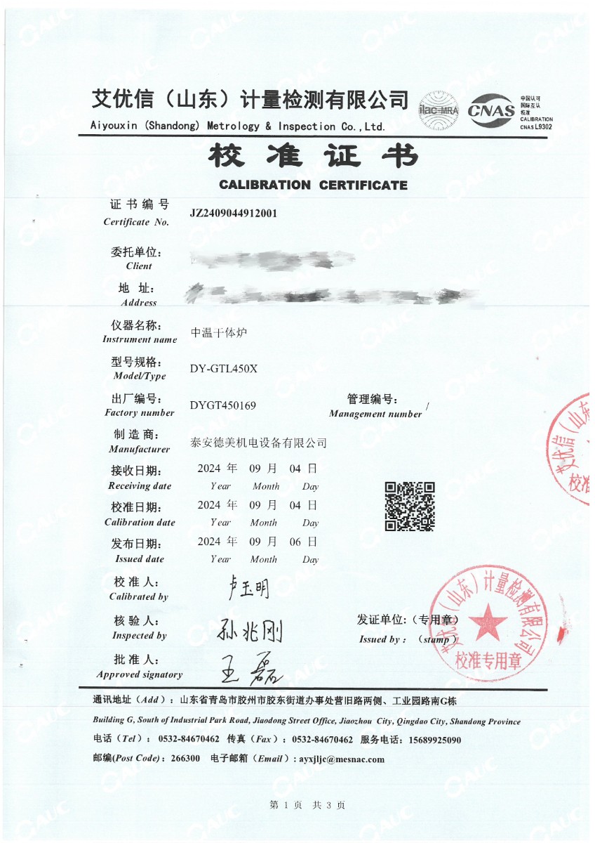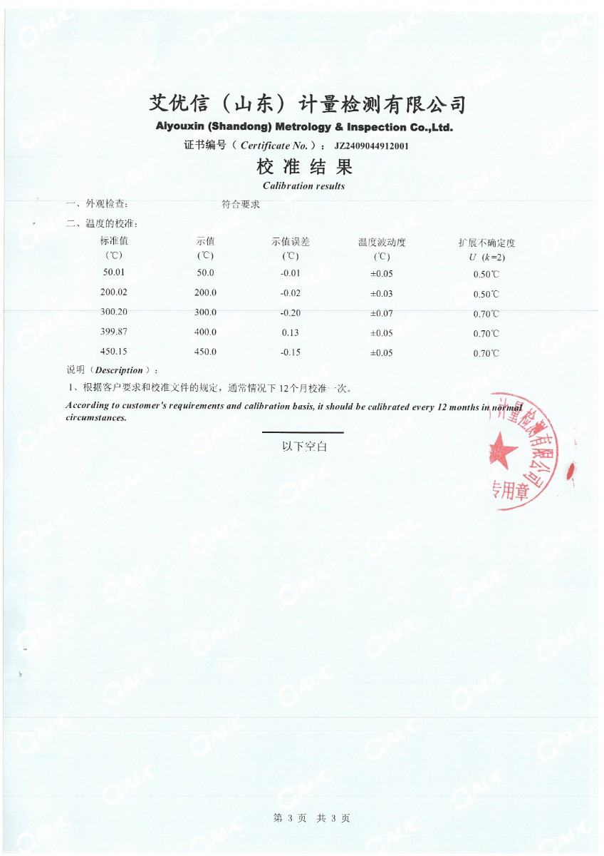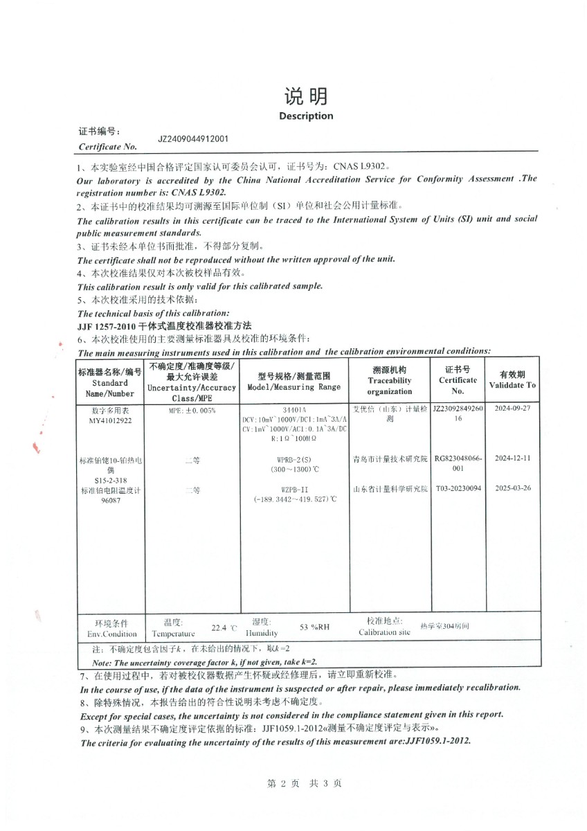 中溫干體(50~450℃)校準證書 2024-9-18 本文被閱讀 6242 次