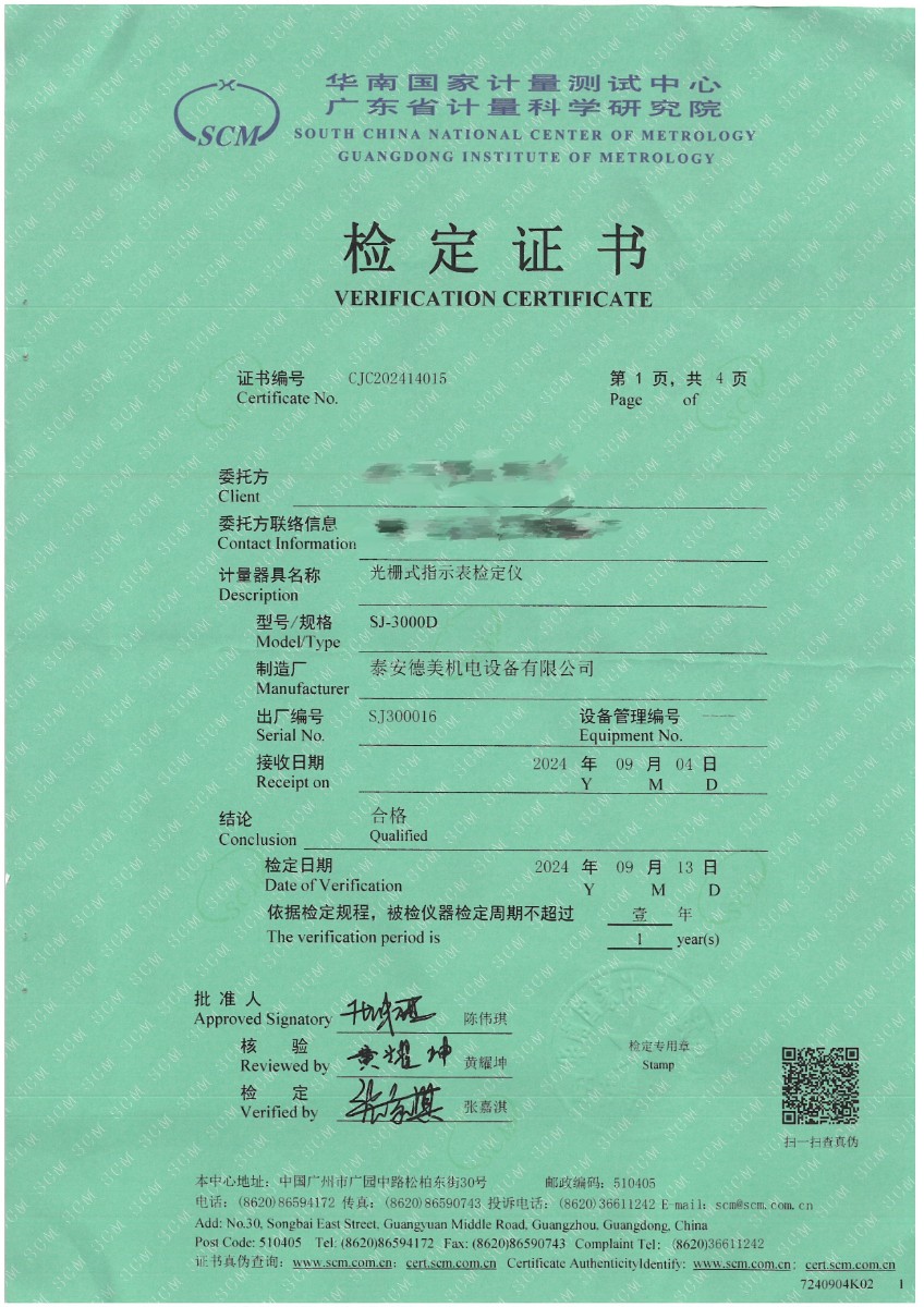 光柵式指示表檢定儀檢定證書 2024-9-20 本文被閱讀 6077 次