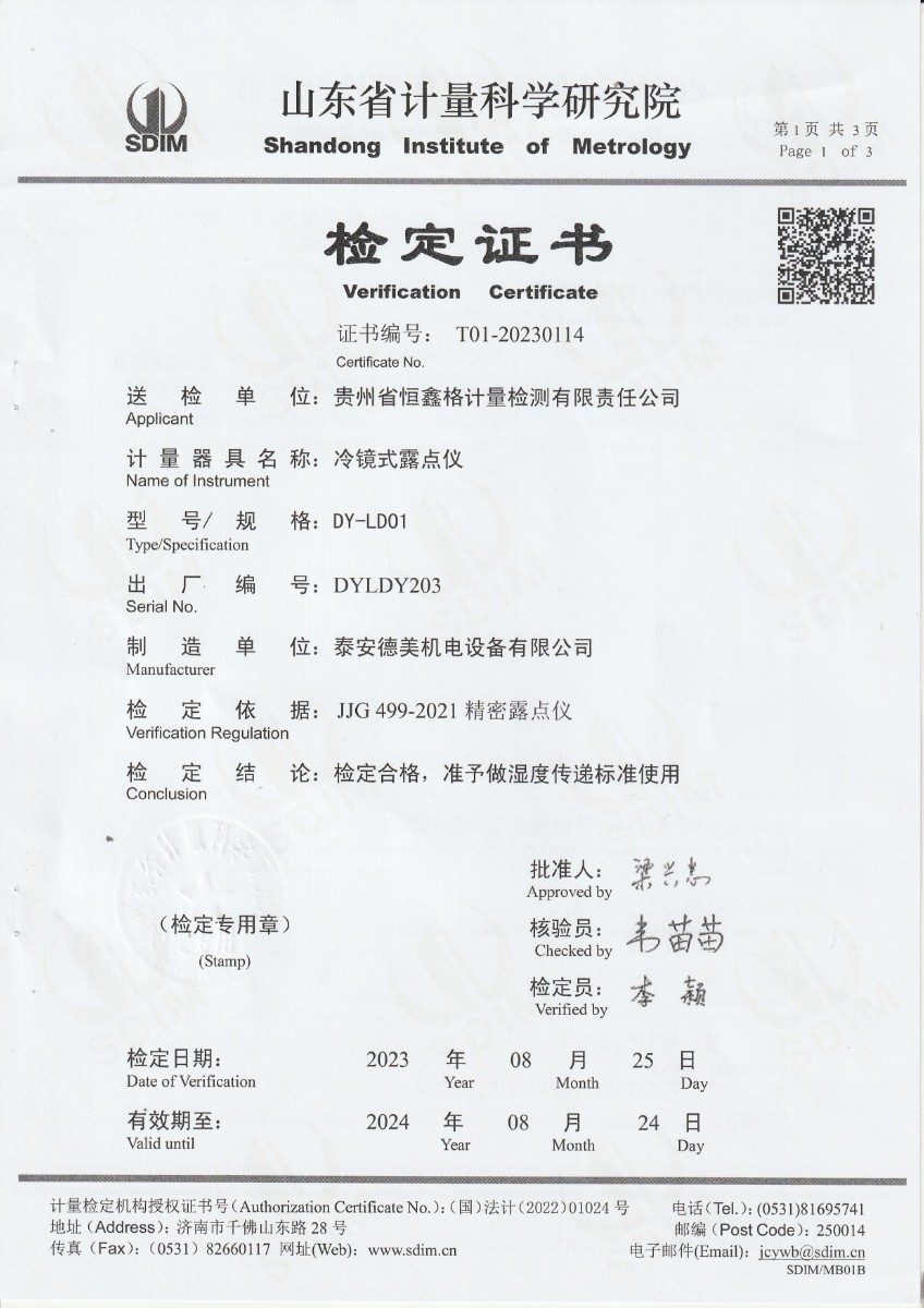 上一條:貴州省恒鑫格計(jì)量檢測有限責(zé)任公司-冷鏡式露點(diǎn)儀校準(zhǔn)證書 | 下一條:超低溫面源黑體爐(-40-80℃)校準(zhǔn)證書 |