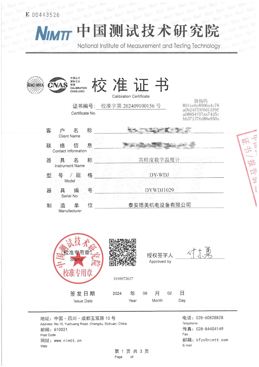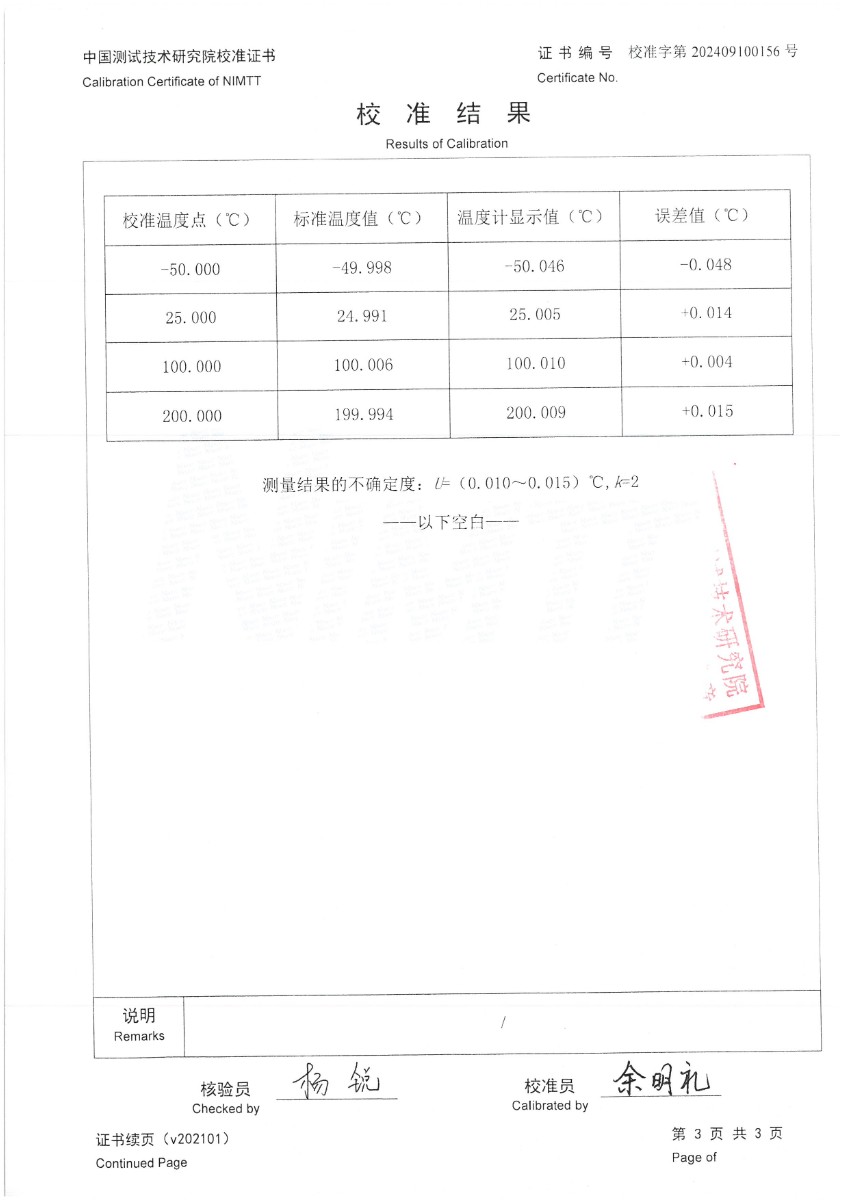 高精度數(shù)字溫度計(-50~200℃)校準證書 2024-9-6 本文被閱讀 5561 次