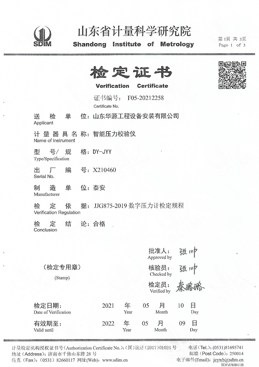 | 上一條:山東華源工程設(shè)備安裝有限公司-智能壓力校驗儀X210459 | 下一條:零點恒溫器校準(zhǔn)證書 |