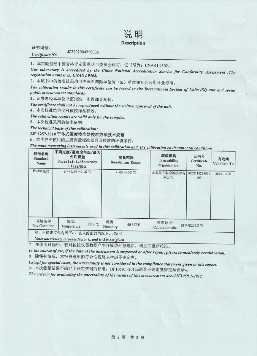 | 上一條:鄭州賽奧電子股份有限公司-干體爐DYGT150245 | 下一條:便攜式干體爐(-30-150℃)校準(zhǔn)證書 |